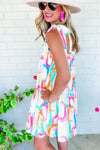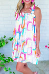 Cette robe courte est entièrement recouverte d’un imprimé abstrait réparti uniformément sur le tissu. Les fines bretelles à nouer sur les épaules permettent un ajustement personnalisé selon la morphologie. Ce système de nouage offre aussi une légère variation dans la manière de porter la robe.